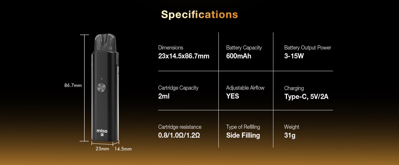 600mAh 15W Pod Kit帶 Type-C Pod 系統電子煙 2ML Pod Cartridge 空煙彈時尚與便利的結合。 便攜性與效率的結合。20分鐘閃充、可互換氣流,新款MISO-C將為您帶來全新的電子煙體驗。
