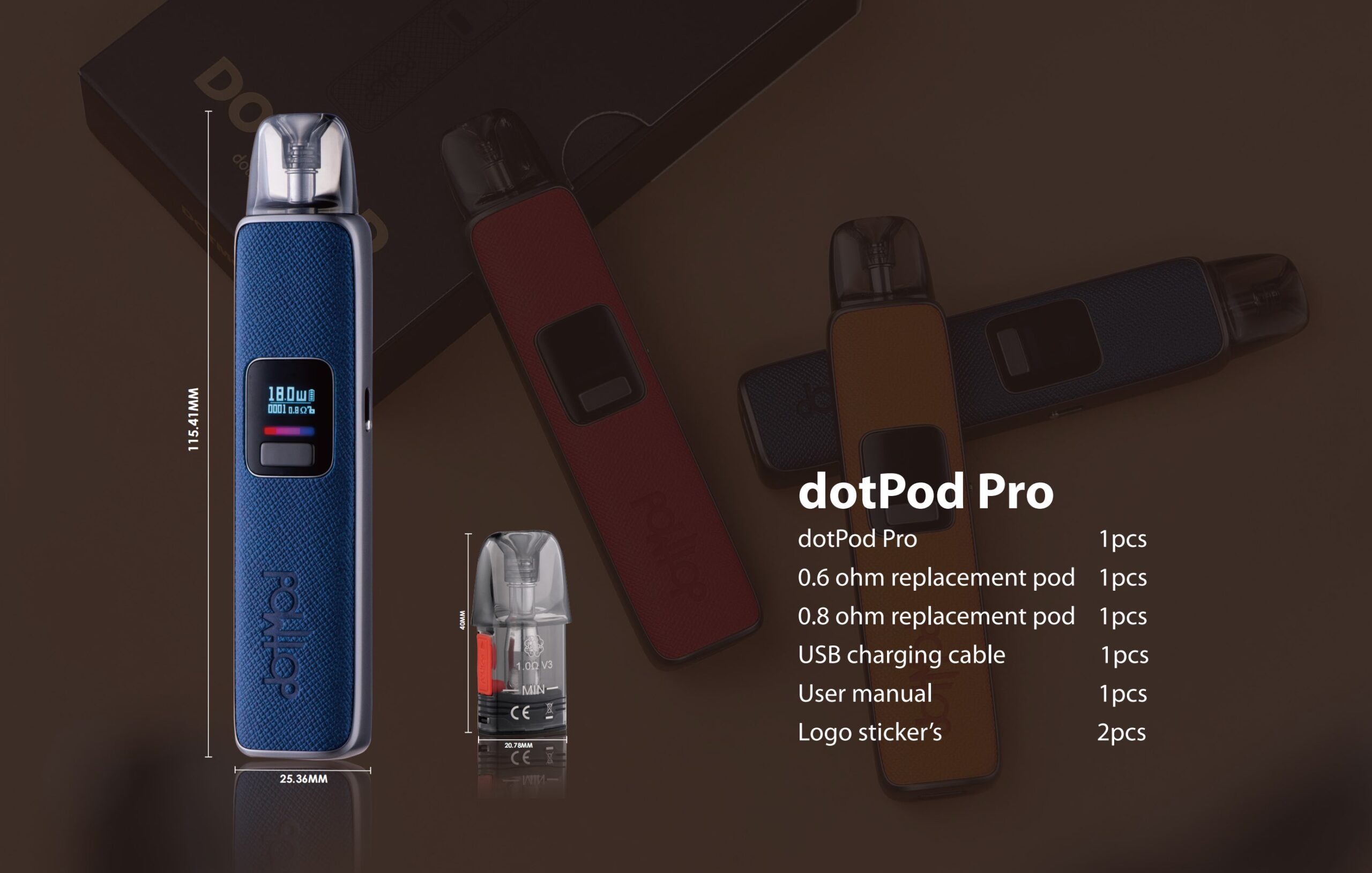 dotPod Pro是dotPod系列中第一款採用高清屏幕和高達35W可調功率的產品。 新一代dotPod煙彈延續了獨特的dotmod皮革風格設計,增加了高清有機發光二極管屏幕 利用最新的防泄漏技術和霧化器煙彈組合解決方案,為您帶來卓越的品味和蒸發體驗。